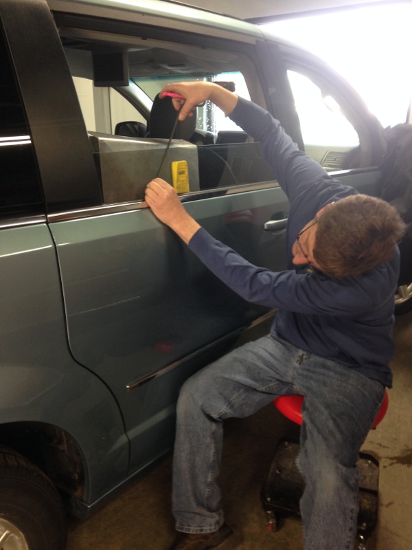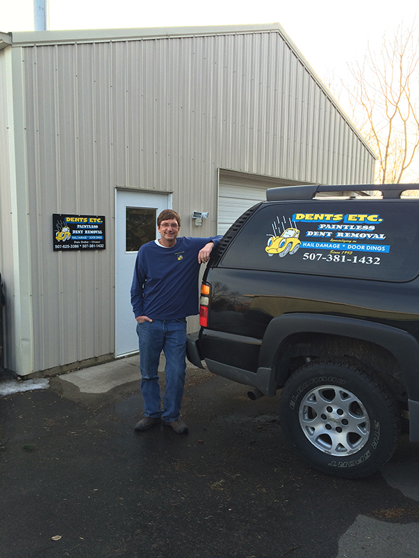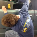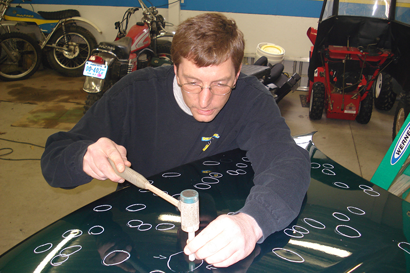 Applying pressure with specialized tools, the technician carefully massages the dent from the backside of the vehicle’s panel. Sometimes, where a dent cannot be accessed from the back, a tab is glued to the outside of the dent and pulled from the top with a slide hammer. Doing these techniques correctly will eliminate the need for refinishing or painting the panel.